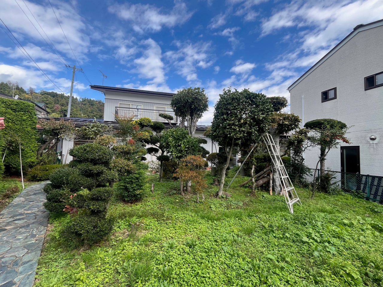 中央に石畳のアプローチが伸び、手入れの行き届いた植栽に囲まれた心地よい庭空間が広がります。