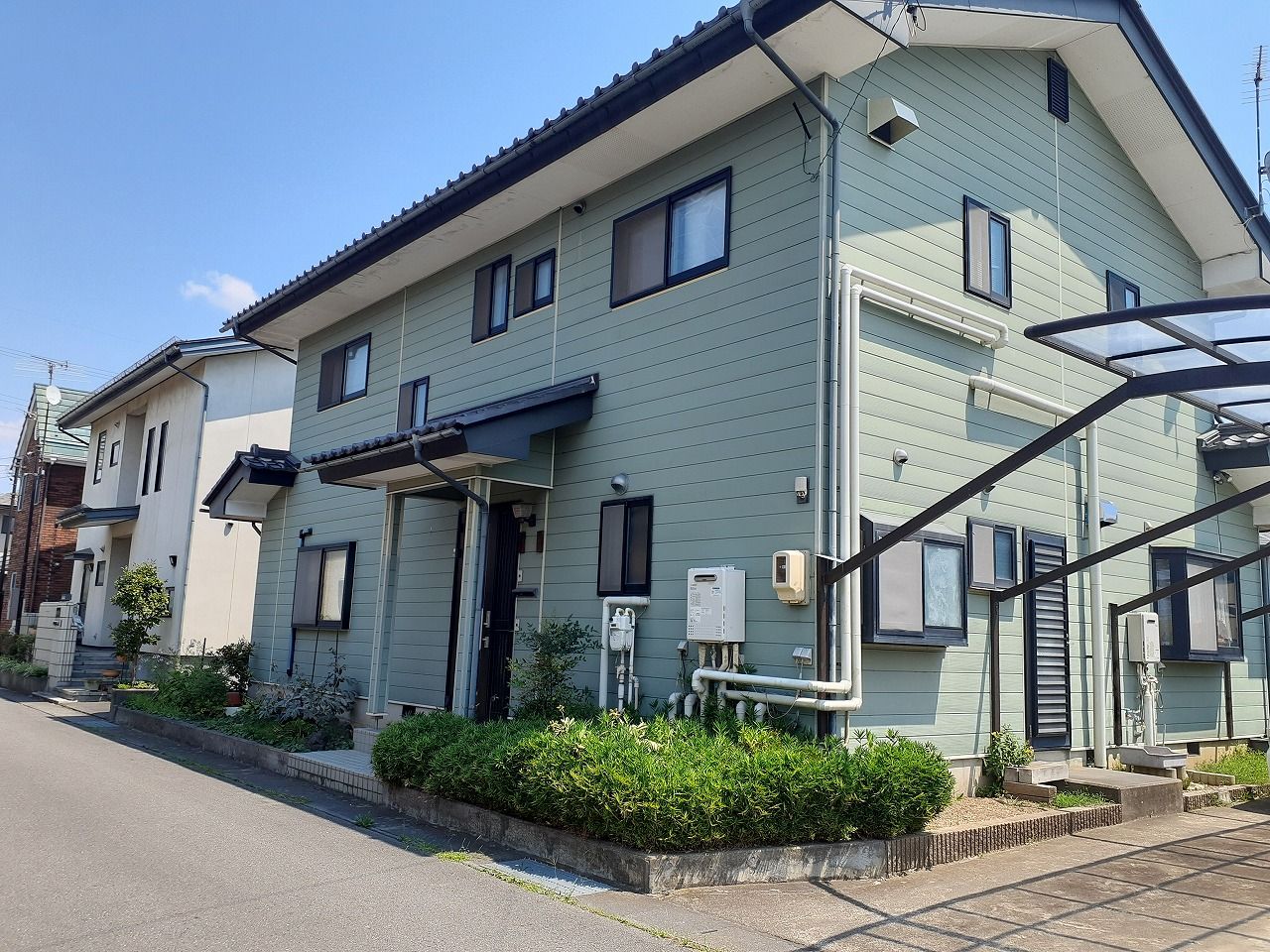 小学校までは徒歩3分・お子様の通学も安心です。爽やかなグリーンの外観が素敵です。