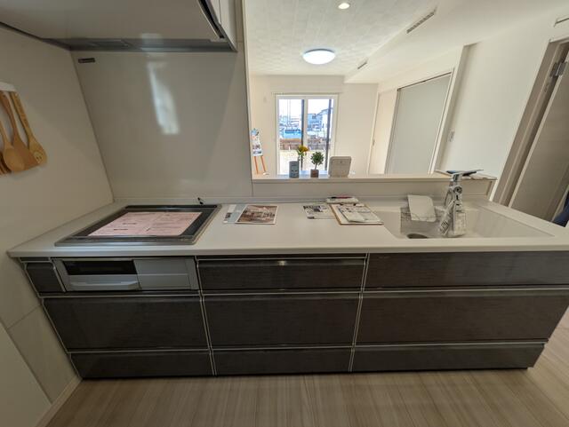 設備 システムキッチン・カウンターキッチン・IHクッキングヒーター・浄水器・TVモニタ付きインターホン・ディンプルキー・温水洗浄便座・オートバス・バス1坪以上・トイレ2箇所・追焚機能・閑静住宅街・24時間換気システム・オール電化・免震構造・洗髪洗面化粧台・照明器具付き・都市ガス・複層ガラス・上水道・下水道・駐車場2台分
