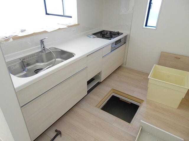 | 設備 | カウンターキッチン・TVモニタ付きインターホン・ディンプルキー・火災警報器(報知機)・温水洗浄便座・オートバス・浴室乾燥機・バス1坪以上・トイレ2箇所・追焚機能・バルコニー・床下収納・24時間換気システム・設計住宅性能評価書・建築住宅性能評価書・洗髪洗面化粧台・都市ガス・複層ガラス・下水道・駐車場2台分 |