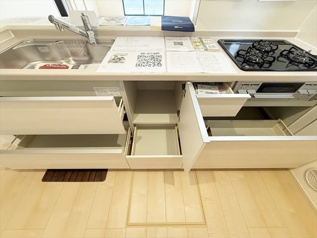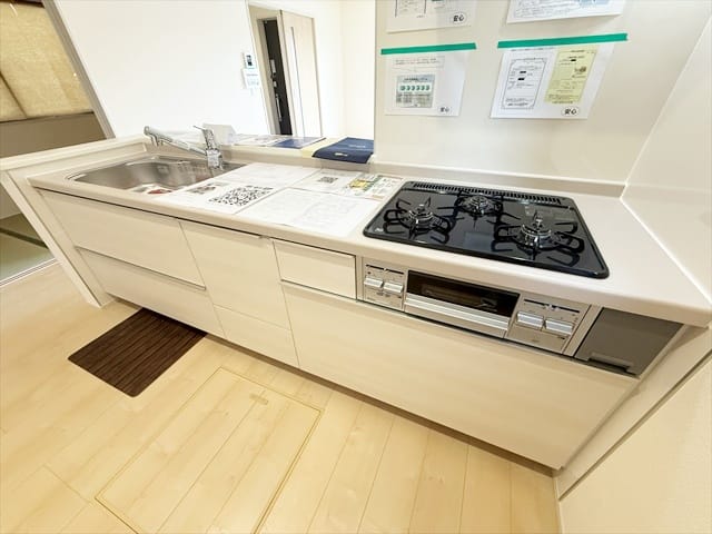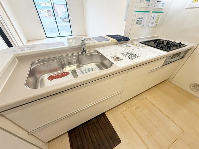 公営水道、公共本下水、プロパンガス、駐車場2台分、住宅性能保証付き、トイレ2ヶ所、温水洗浄暖房便座、オートバス、追焚き機能、浴室乾燥機、浄水器、床下収納、システムキッチン、洗髪洗面化粧台