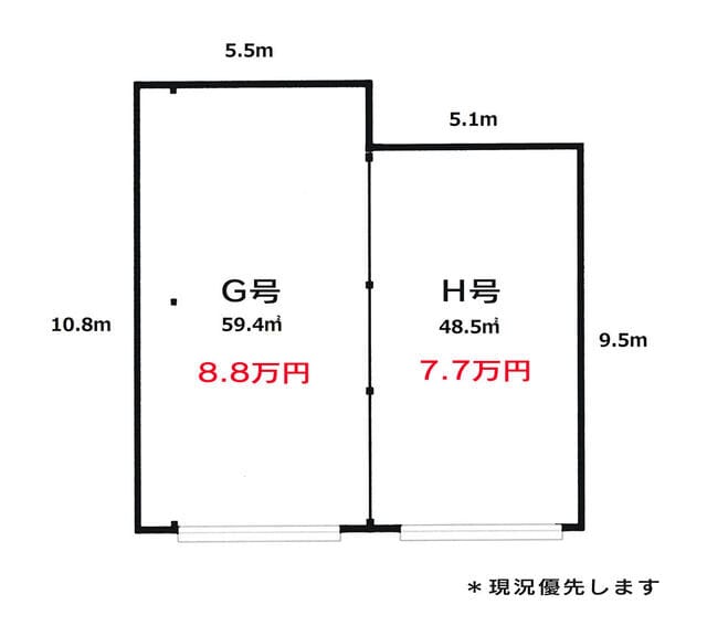 全2区画有り、両区画とも土間コン敷、照明・コンセント有、・G号/59.4㎡/賃料8.8万円・H号/48.5㎡/7.7万円個別契約の場合はG/Hの仕切り板設置予定、倉庫などの事業利用ほか、スチール取り外しのうえ一括契約も可能となりますガレージ進入路は隣接の事務所敷地の一部を含み幅4m以上有り、敷地内は舗装敷、高低差なし法人事業契約は別途家財保険必要(8,800円、契約期間3年)